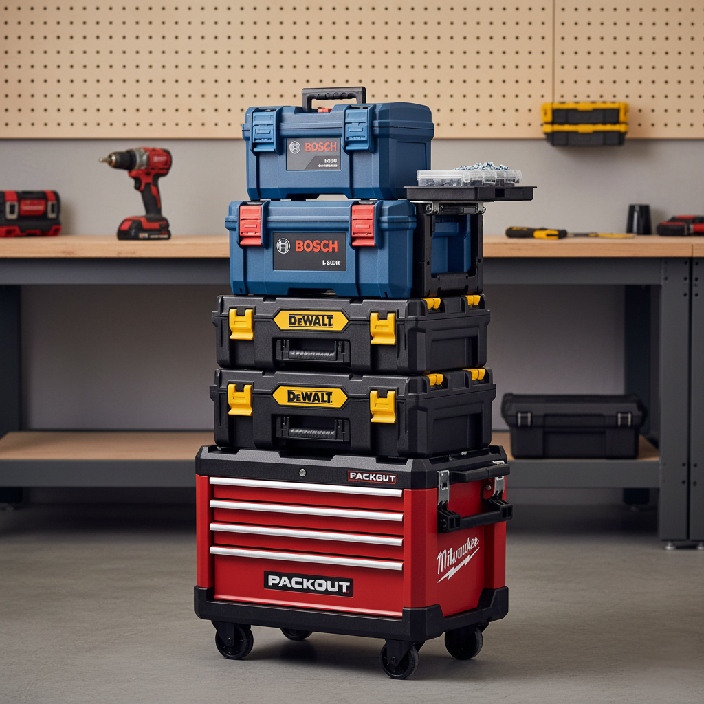 O que é: Um conjunto de caixas e organizadores que se encaixam e se travam, formando um sistema de transporte unificado. Linhas como Packout (Milwaukee), TSTAK (DeWalt) e L-BOXX (Bosch) são as mais famosas.