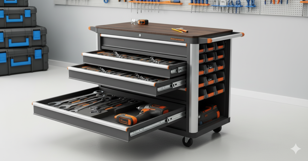 Análise: É o segredo para evitar que as gavetas do seu carrinho se tornem um ninho de ratos de metal. Com organizadores, cada chave, soquete e bit tem seu lugar designado. Isso não apenas acelera o trabalho, mas também permite que você veja imediatamente se alguma ferramenta está faltando no final do dia.